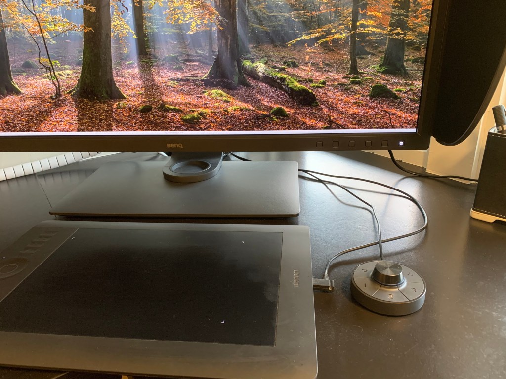 The Benq SW 321c is a huge display. As the name suggests, it is 32 inches. That may not sound very much bigger than your regular 25 or 27-inch panel, but side-by-side, the screen area dwarfs the screen area of my 27-inch iMac. At the same time, it somewhat matches in external size, as the iMac has a large area under its proper screen and the Benq has a very slim frame. It has a nice, contemporary design, smoothly blending into a modern office environment. The small footprint means that it doesn’t take up too much of your precious desk space. The display can be adjusted in all directions on the very solid and stable foot and even rotated for portrait orientation. This way you can use the whole screen when editing vertical images.