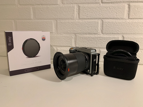 The Professional system filter-holder mounted on the Hasselblad xcd 21mm. There is no vignetting and the magnetic filters do not fall off by accident. Notice the small pouch that fits the whole system.