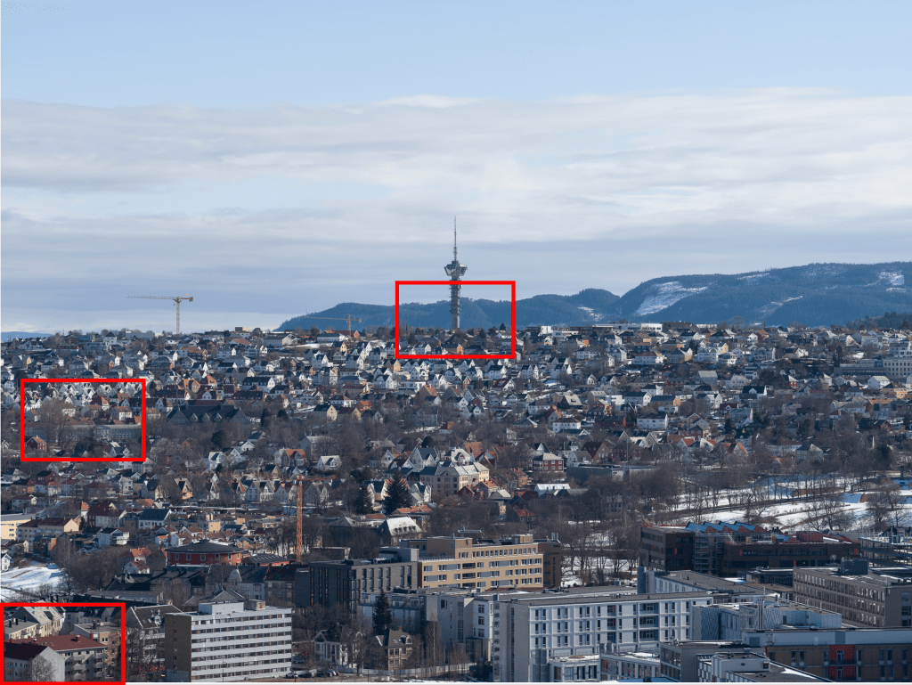 Sharpness and chromatic aberrations were evaluated on 300% enlargements in centre, left edge and extreme lower left corner, corresponding approximately to the red squares shown above. The crops are shown below. To the left you will see the unedited file (only deconvolution sharpening) and on the right you can see an edited version after removal of chromatic aberrations in Lightroom and sharpening in Topaz Sharpen AI. Drag the slider to alternate between the two versions.