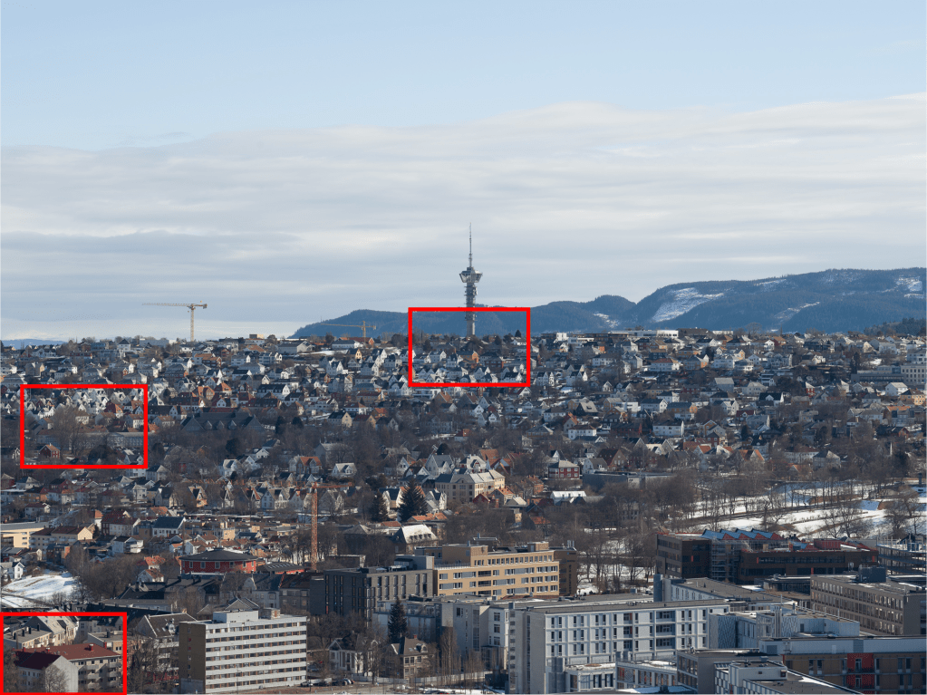 Sharpness and chromatic aberrations were evaluated on 300% enlargements in centre, left edge and extreme lower left corner, corresponding approximately to the red squares in the frame below. The crops are shown below for each of the three focal-lengths tested. To the left in the crop you will see the unedited file (only deconvolution sharpening) and on the right you can see an edited version after removal of chromatic aberrations in Lightroom and sharpening in Topaz Sharpen AI. Drag the slider to alternate between the two versions.