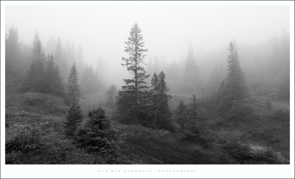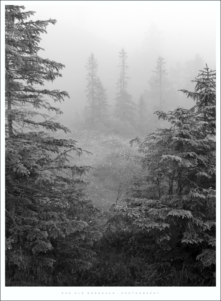 I knew beforehand that I probably would have to work in black and white. The skies were grey and heavy above the fog, and there were little to no chances for the sun to break through and give some colors. Light was very blue, and the vibrant greens of spring are long gone, giving way for a more dull summery greens. Add fog, and I knew colors would be weird or dull at best.