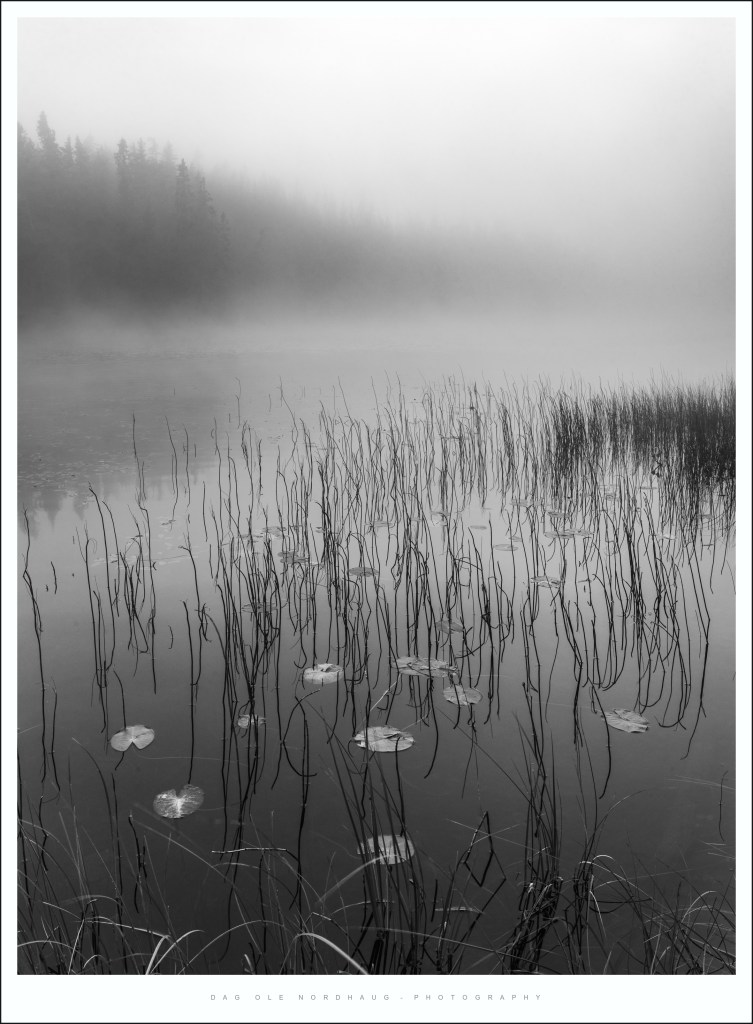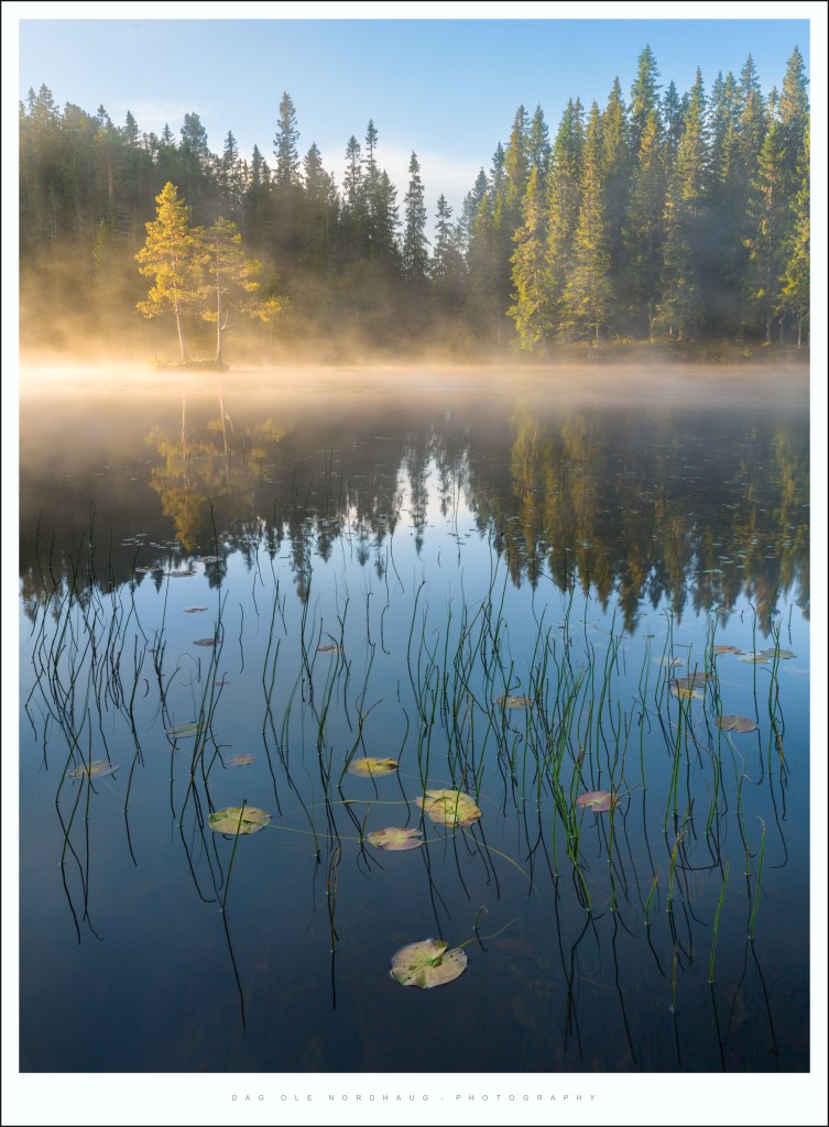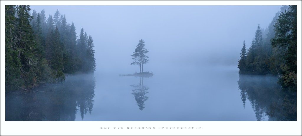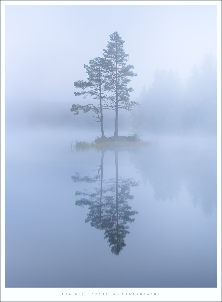 This particular morning in the beginning of September I visited the lake Leirsjøen. I know that this area is particular prone to morning fog, and there is a picturesque small island with two good looking trees on it in the middle of the lake. Fog separates this island from the background and makes for a really nice subject, or focal point if you will.
